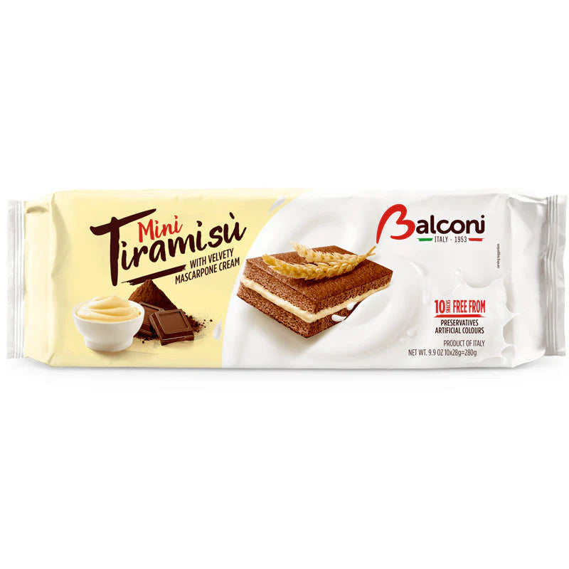 Balconi Mini Tiramisu Snack Cake is a popular snack from Italy. Indulge in the authentic taste of Italy with Balconi Mini Tiramisu Snack Cakes. Expertly crafted, these individually portioned delights combine soft, coffee-infused sponge cake with a smooth, creamy tiramisu filling. Each mini cake is lightly dusted with cocoa powder, capturing the essence of the classic dessert in a convenient, ready-to-enjoy format. Perfect for lunchboxes, coffee breaks, or after-dinner treats, Balconi delivers a little moment of luxury in every bite.