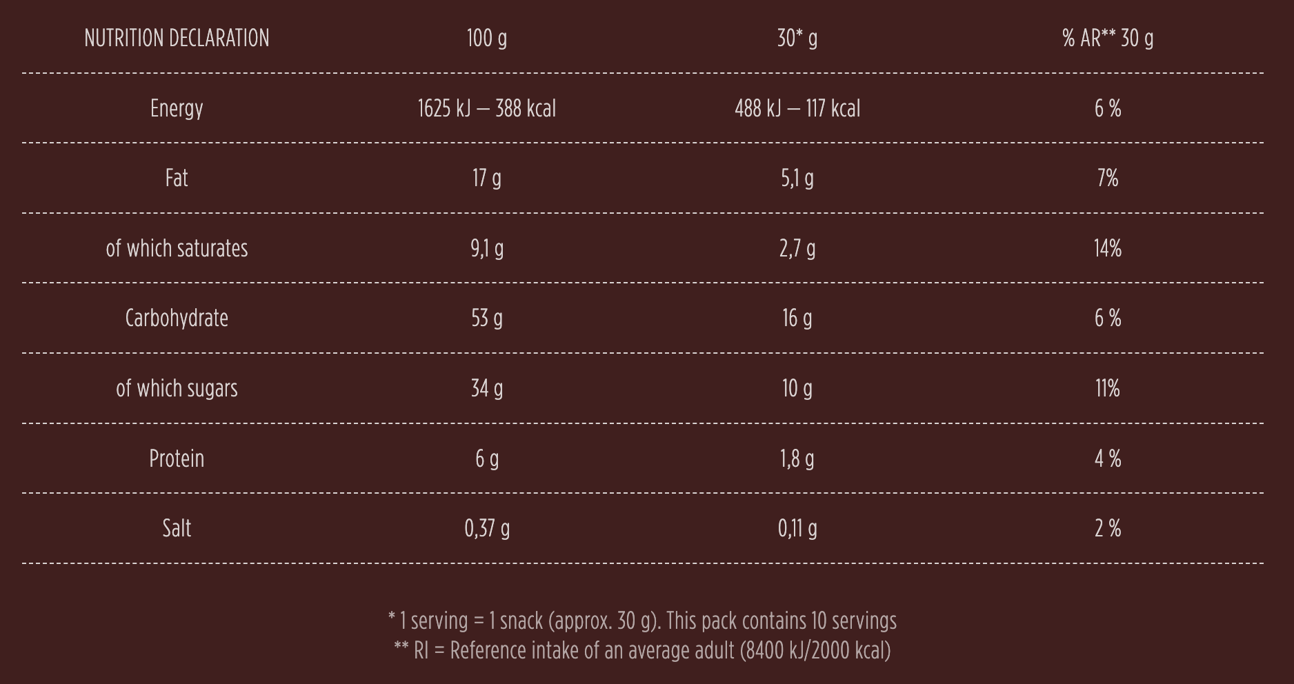 Ingredients: Sugar Fresh Eggs Vegetable Fats (Palm, Sunflower In Varying Proportions) Wheat Flour (14.9%) Reconstituted Skimmed Milk (12.3%) Glucose-fructose Syrup Powdered Skim Milk Extra Fine Chocolate (2.3%) (Sugar, Cocoa Paste, Cocoa Butter, Emulsifier: Soya Lecithin Flavourings) Mascarpone (1.7%) [cream (Milk), Acidity Regulator: Citric Acid] Liquid Coffee (1.4%) On The Finished Product Flavourings Fat-reduced Cocoa Powder Milk Proteins Emulsifiers: Mono- And Diglycerides Of Fatty Acids, Soya Lecithin Raising Agents: Ammonium Carbonates, Sodium Carbonates, Diphosphates Salt Stabilizer: Pectin. Allergenes: Wheat, Eggs, Milk, Mascarpone And Soya.