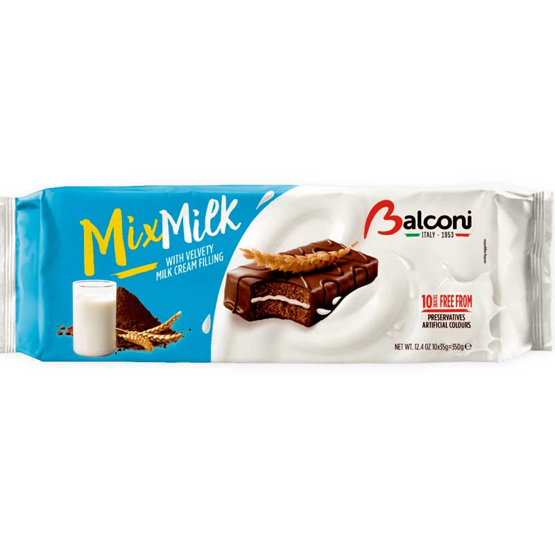 Balconi Mix Milk Sponge Cake is a popular snack from Italy. Indulge in the perfect combination of soft, airy sponge cake, creamy filling, and rich chocolate with Balconi MixMilk Sponge Cake. Each piece is a delightful treat that combines the lightness of sponge cake with the smoothness of a creamy filling, all generously coated in a layer of milk chocolate. Ideal for satisfying your sweet cravings, Balconi MixMilk Sponge Cake makes for an irresistible snack or dessert.