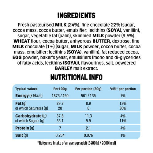 Ingredients: Fresh Pasteurised Milk (24%), Fine Chocolate 22% (Sugar, Cocoa Mass, Cocoa Butter, Emulsifier: Lecithins (Soya), Vanillin), Sugar, Palm Oil, Skimmed Milk Powder (9.5%), Wheat Flour, Cocoa Butter, Cocentrated Butter, Dextrose (Wheat), Fine Milk Chocolate (1%) (Sugar, Milk Powder, Cocoa Butter, Cocoa Mass, Emulsifier: Lecithins (Soya), Vanillin), Fat Reduced Cocoa, Egg Powder, Baker's Yeast, Flavourings, Emulsifiers (Mono And Di-glycerides Of Fatty Acids, Lecithins (Soya)), Salt, Powdered Barley Malt Extract