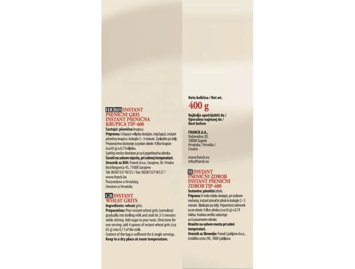 Franck Griz Cream of Wheat is a popular ingredient from Croatia. Start your day the warm and comforting way with Franck Griz Cream of Wheat, a quick and easy breakfast option. In just 2-3 minutes, you can enjoy a deliciously smooth, velvety bowl of cream of wheat that's perfect for those chilly mornings. Made from finely ground wheat, this nutritious cereal is a great source of energy to fuel your day. Each 400g bag provides enough for 6 hearty servings, making it an ideal choice for families, busy mornings, or a wholesome treat.