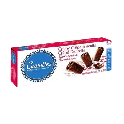 Gavottes’ Crepe Dentelle cookies covered in dark chocolate are rich, fragrant, light, thin, and airy authentic French delicacies with an irresistible concoction of sweet and chocolatey flavors. Characterized by their beautiful golden interior, crispy texture, and pleasant aromas, these mouth-watering treats are covered in decadent dark chocolate.