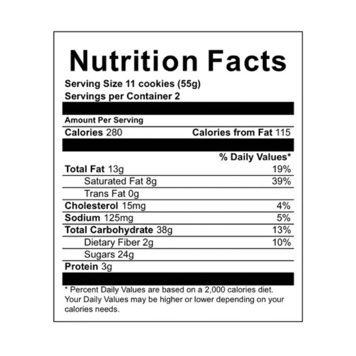 Ingredients: Dark chocolate 43% (cocoa mass, sugar, cocoa butter, concentrated pastry butter, emulsifier: soya lecithin, natural flavoring of vanilla), wheat flour, sugar, concentrated pastry butter 5%, lactose and milk proteins, salt, barley malt extract, raising agent: sodium hydrogen carbonate. Contains gluten, milk, soya.