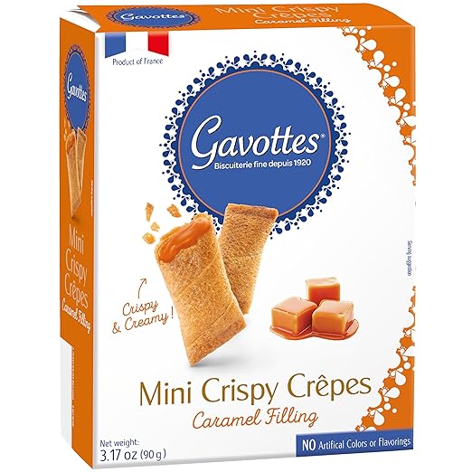 Gavottes’ wafer bites with caramel filling are fragrant, flavorful, and adorable authentic French delicacies with an enticing combination of sweet and caramel flavors. Characterized by their crispy texture, golden appearance, and pleasing aromas, these bite-sized wafers are filled with soft and velvety caramel cream.