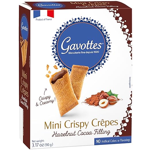 Gavottes’ wafer bites with chocolate and hazelnut cream filling are rich, versatile, and aromatic bite-sized authentic French delicacies with the perfect symphony of refined sweet and chocolatey flavors. Filled with creamy, velvety, and smooth chocolate filling carrying notes of hazelnut, these full-flavored wafer bites are known for their crispy texture and beautiful golden appearance.