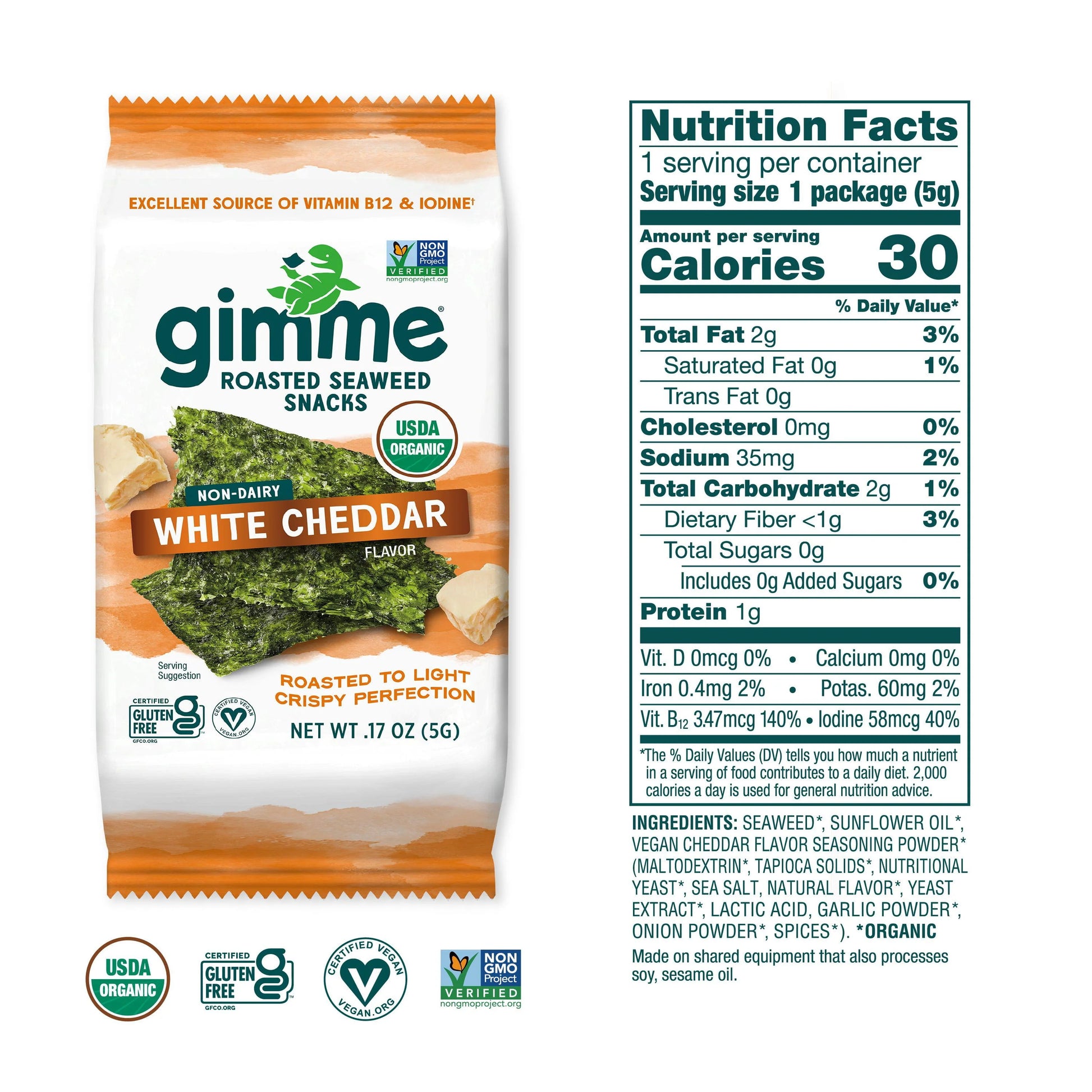 All the cheddar flavor you can savor, but totally dairy free. gimme premium organic seaweed is roasted to light, crispy perfection with organic sunflower oil, and dusted with sharp cheddar.