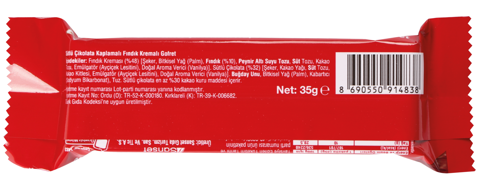 Ingredients:Hazelnut Cream (48%) [Sugar, Vegetable Oil (Palm), Hazelnut (10%), Whey Powder, Milk Powder, Cocoa Powder, Emulsifier (Sunflower Lecithin), Natural Flavoring (Vanilla)], Milk Chocolate (% 32) [Sugar, Cocoa Butter, Milk Powder, Cocoa Bulk, Emulsifier (Sunflower Lecithin), Natural Flavoring (Vanilla)]. Wheat Flour, Vegetable Oil (Palm), Riser (Sodium Bicarbonate), Salt