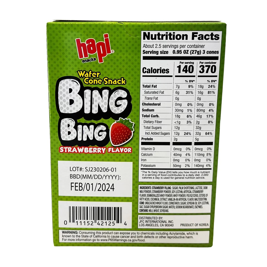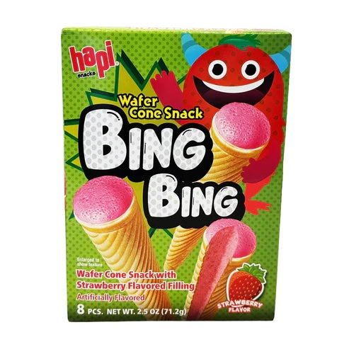 Hapi Bing Bing Ice Cream Cone Snack Strawberry Flavor are soft crunchy wafer cones with rich strawberry filling. Try this tasty snack on the go!
