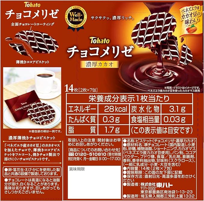 These delicious chocolate biscuits from Tohato are double-coated with a layer of real chocolate made of Venezuelan cacao beans. Though these biscuits may sound quite rich, they actually have the perfect balance of sweetness and chocolate flavor.