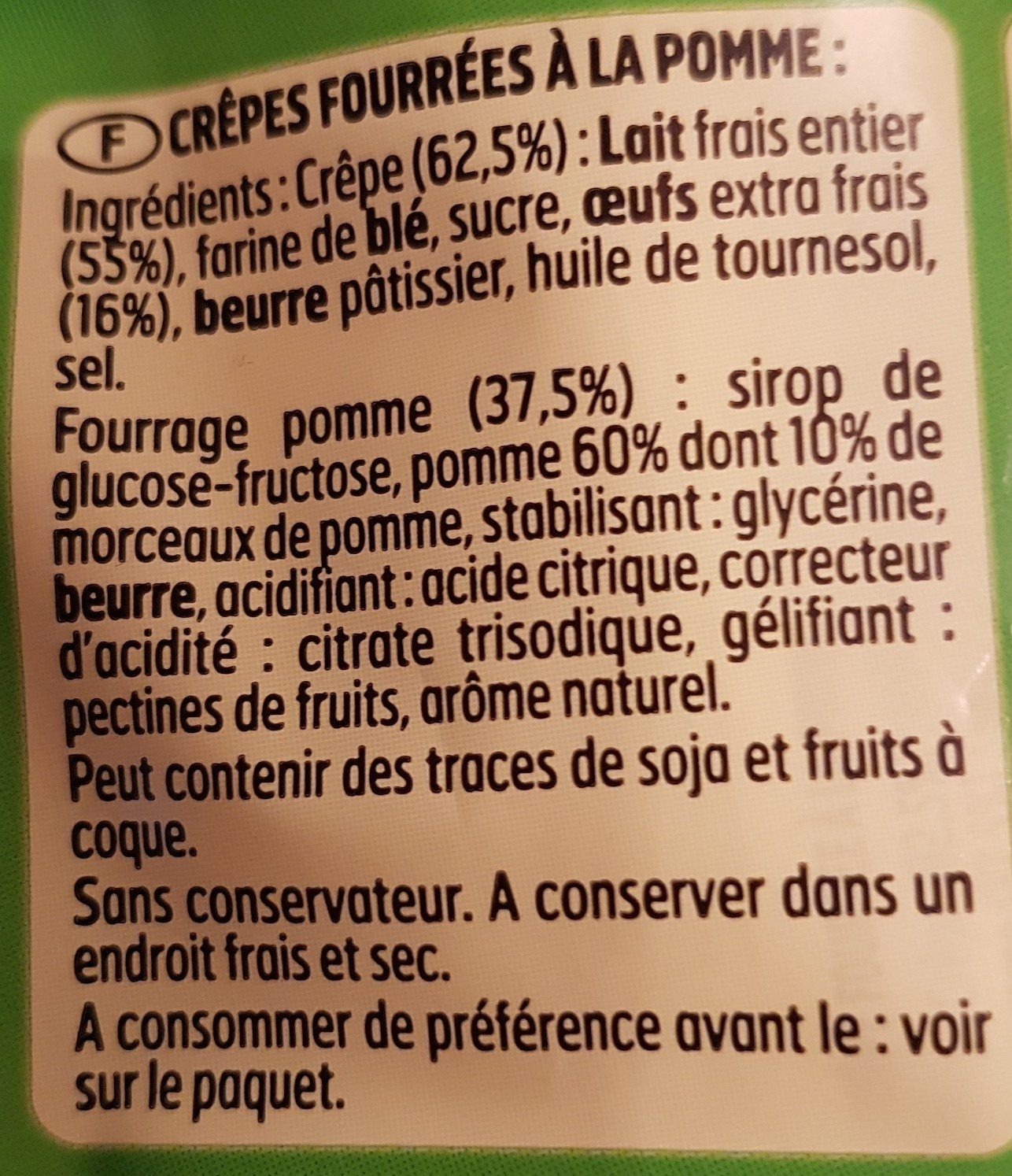 Ingredients: Fresh whole milk, wheat flour , sugar, extra fresh eggs (16%), pastry butter , sunflower oil, salt. Apple filling (37.5%): glucose-fructose syrup, apple including apple pieces, stabilizer: glycerin, butter , acidifier: citric acid, acidity regulator: trisodium citrate, gelling agent: fruit pectins, natural flavor